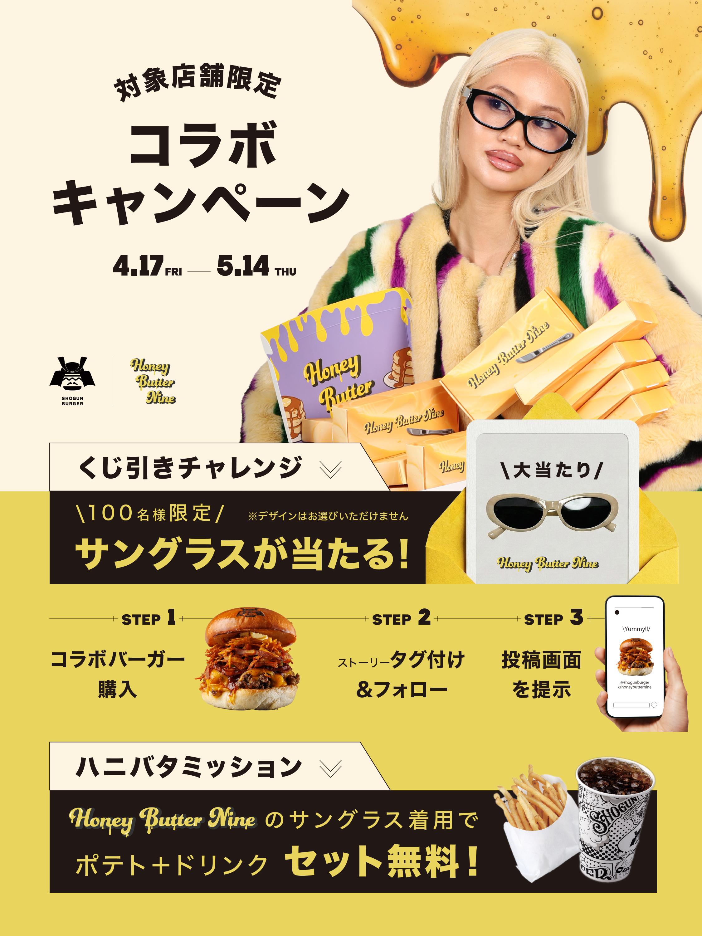 さらに、Honey Butter Nineのサングラスを着用してご来店のうえバーガーをご注文いただくと、ポテト+ドリンクセットを無料でご提供いたします。